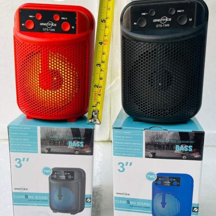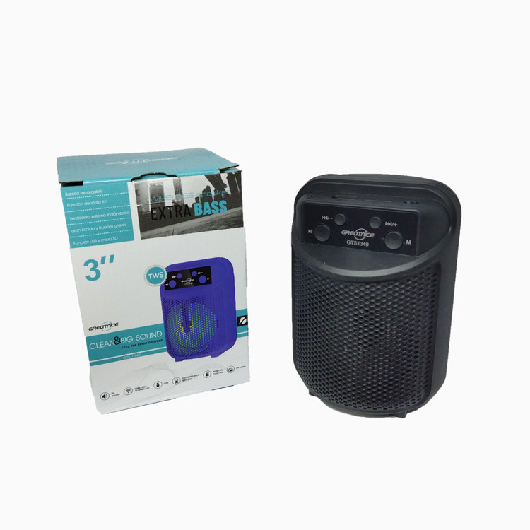 اسپیکر شارژی با بلوتوث GREATNICE مدل GTS-1349 با قابلیت پخش فایل های صوتی با فرمت mp3 از طریق فلش مموری و کارت حافظه TF را می توان بعنوان یک اسپیکر قابل حمل در سفر و یا در منزل و محل کار استفاده کرد . دستگاه از یک باتری شارژی لیتیوم یون بهره می برد و با شارژ در مدت زمان تقریبی 2 ساعت بطور کامل شارژ می شود . همچین این اسپیکر از رادیو FM با قابلیت انتخاب ایستگاههای رادیویی به روش دیجیتال و با فشردن یک دکمه صورت می گیرد .قطر بلندگوی دستگاه 3 اینچ و یا 7.5 سانتیمتر است و صدای خروجی آن در حدود 3 وات واقعی قدرت دارد . با اتصال دستگاه به موبایل از طریق بلوتوث می توان فایل های صوتی را ازدستگاه پخش کرد .