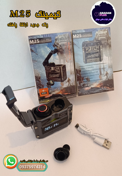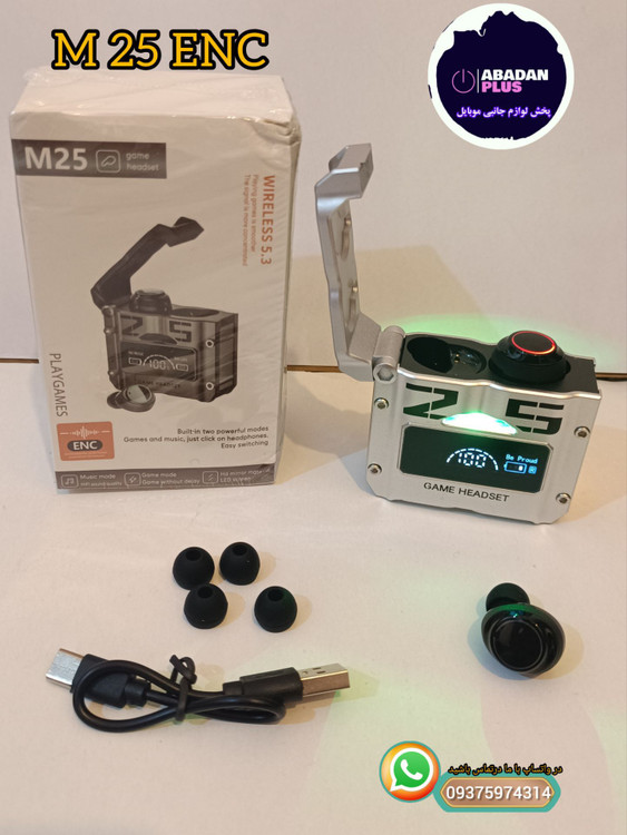 اگر به دنبال تهیه یک هدفون بیسیم گیمینگ و استفاده روزانه هستید ، هندزفری بلوتوثی گیمینگ مدل M25 ENC یک ایرپاد مخصوص بازی و استفاده روزانه است که با طراحی اسپرت با افکت های لامپ های 7 رنگ RGB ظاهر جذاب برای استفاده روزانه را به شما اراِِئه می نماید. این مدل برای اتصال به دستگاه به بلوتوث نسخه 5.3 مجهز شده است و در مدت زمان کوتاه ، اتصال با گوشی موبایل اندروید یا ios شما برقرار خواهد شد.از ویژگیهای اصلی این محصول محفظه نگهدارنده یا همان کیس آن است. این کیس قابلیت شارژ هدفون را دارد. برای شارژ آن کافی است از درگاه USB-C تعبیه شده بر روی کیس و کابل شارژ درون بسته بندی استفاده کنید. همچنین این ایرپاد گیمینگ دارای یک میکروفون با کیفیت است و این ویژگی ، آن را برای مکالمه مناسب میسازد . از قابلیت های این محصول میتوان به ضد آب بودن ، فعال بودن Siry در آیفون ، HD Voice و ENC است. زیر این محصول یک پورت خروجی USB نیز قرار دارد که به وسیله آن میتوانید از باتری ایرپاد به عنوان پاور بانک اضطراری نیز استفاده کنید